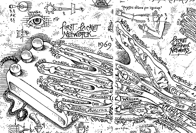 Cet ancien manuscrit est un rendu artistique de la récente histoire des réseaux et d'ARPANET, rendant hommage aux personnes principales qui l'ont créées. |
