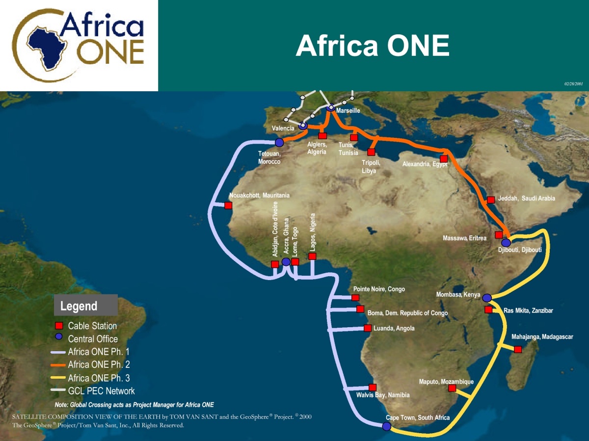 La carte représentant les trois phases de la mise en place du câble optique Africa ONE . |