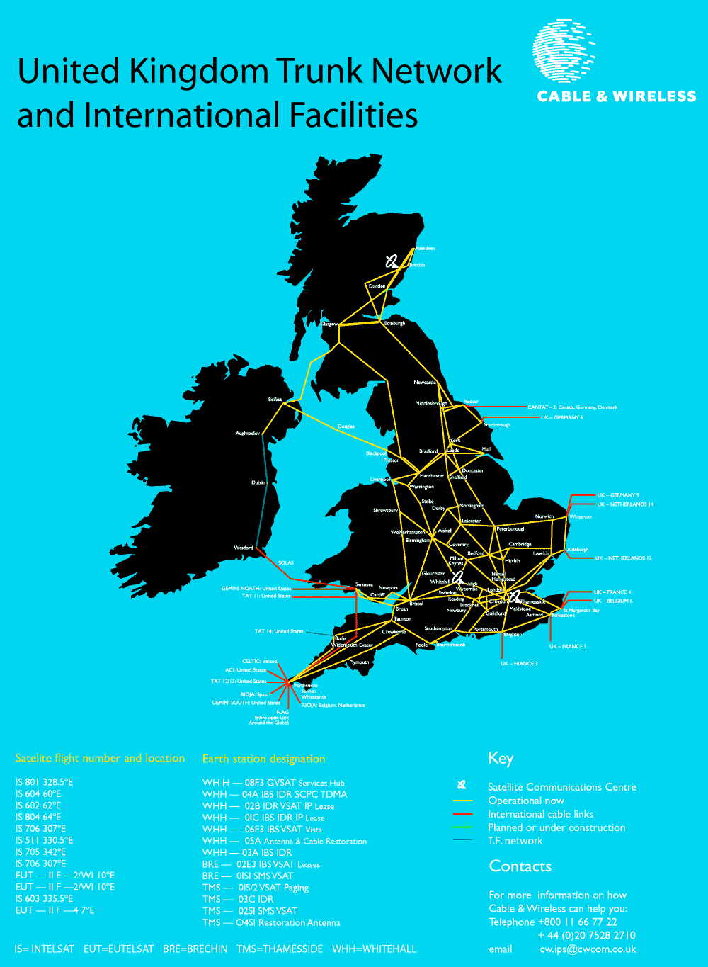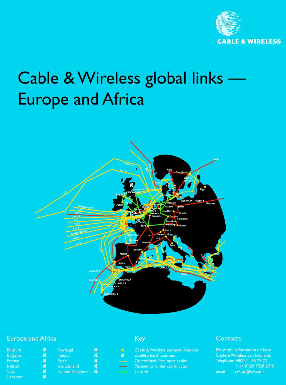 Cable & Wireless est un opérateur international de télécommunications par câbles sous-marins présent dans de nombreuses régions dans le monde. Ces cartes montrent les infrastuctures réseaux anglaises et européennes de Cable & Wireless. |