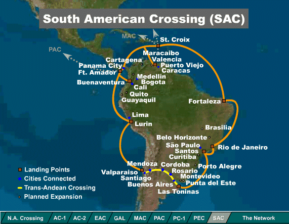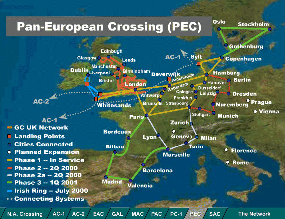 Cartes de l'infrastructure réseau de Global Crossing, un des leaders parmi les opérateurs de réseaux. Ces cartes montrent l'état d'avancement de mise en place et de prévision des réseaux en Amérique du sud et en Europe, au printemps 2000. Essayez leur carte interactive de différentes régions. |