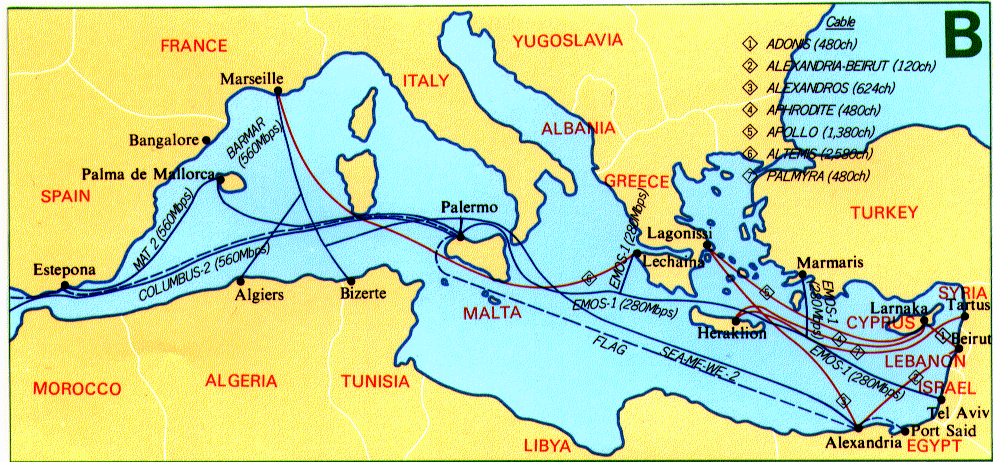 Une carte montrant l'infrastructure des câbles sous-marins de KDD Submarine Cable Systems Inc. dans la région asiatique en 1996. Un ensemble de cartes était disponible pour différentes régions du monde en 1993, 1994 et 1996. KDD est un opérateur majeur de télécommunications, et sa division des câbles sous-marins un des fournisseurs leader, installant et entretenant des câbles partout dans le monde. Ci-dessous une autre carte de l'infrastructure de KDD dans la région méditerranéenne en 1996. |