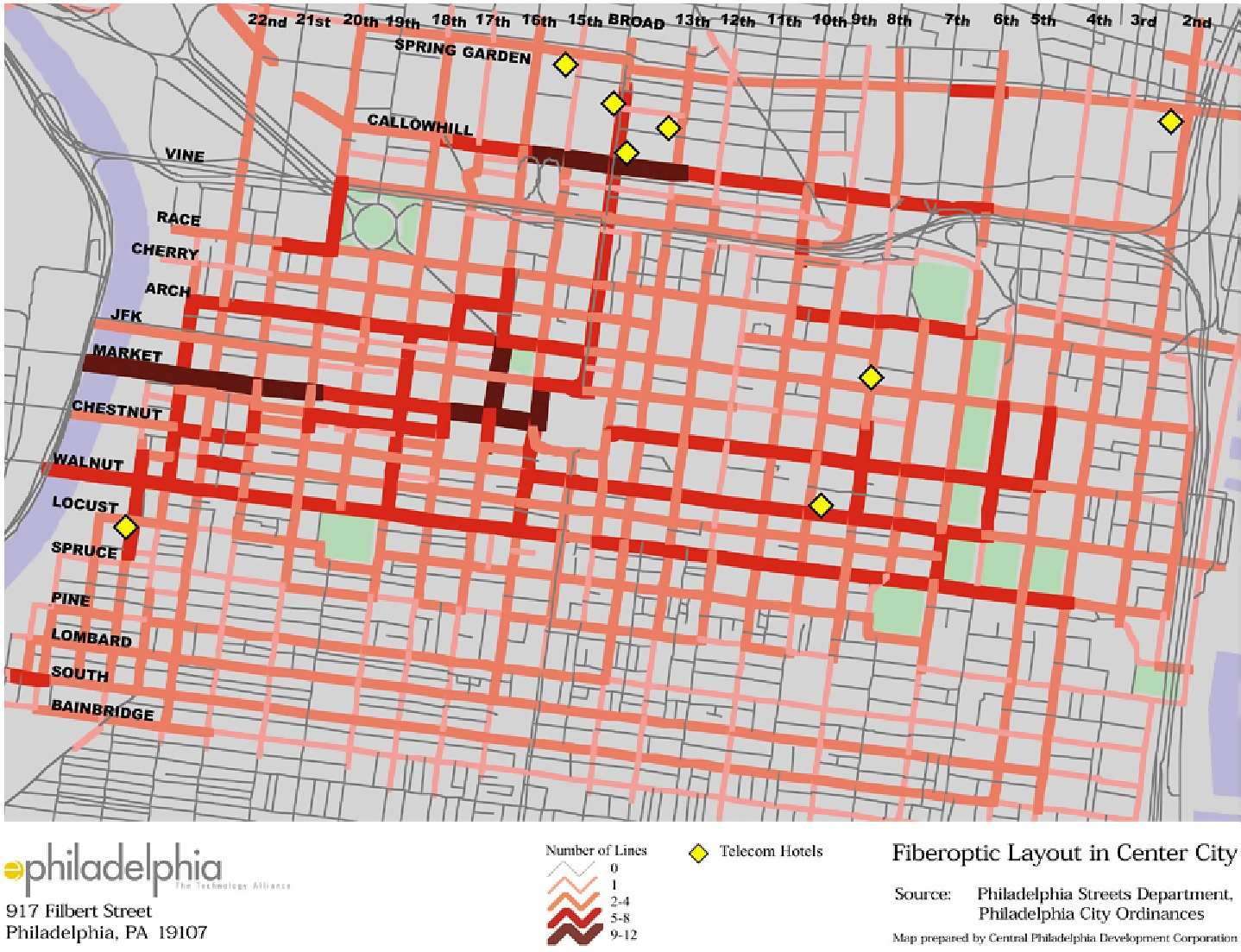Une carte du réseau de câbles de fibres optiques du centre de Philadelphie, produite par la Central Philadelphia Development Corporation. Plus les lignes rouges sont épaisses et sombres, plus les câbles optiques sont profondément enfouis sous la rue. Les losanges jaunes symbolisent la localisation des centres des télécoms. |