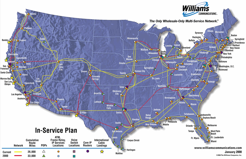 Une carte du réseau de grande envergure de Williams Communications couvrant pratiquement les Etats-Unis. Cette carte montre l'étendue du réseau en Janvier 2000. Pour de plus récentes informations consulter leur carte interactive. |