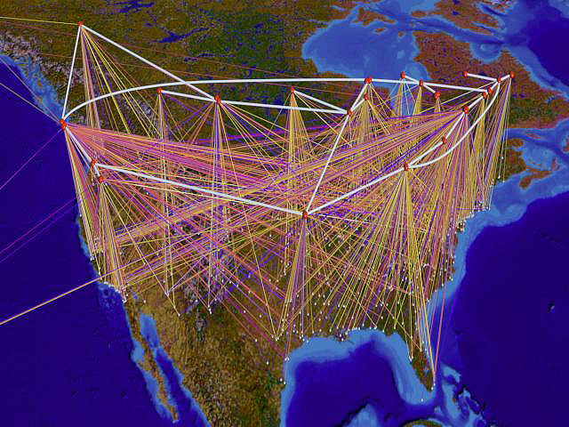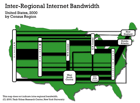 Un exemple de cartes Internet produites par Anthony Townsend. Il recherche la géographie d'Internet dans le cadre du projet Information City. Davantage de cartes sont disponible dans leur galerie. |