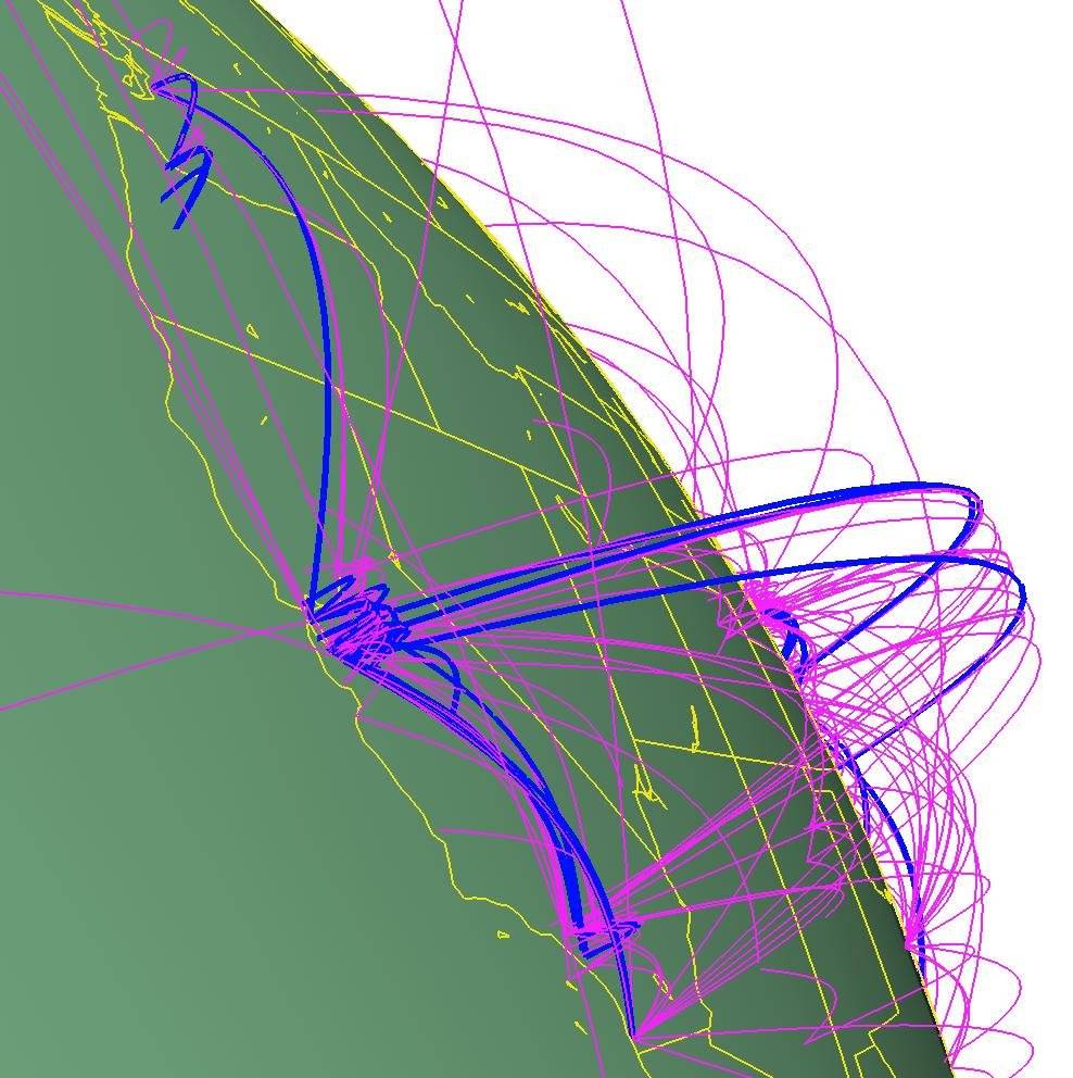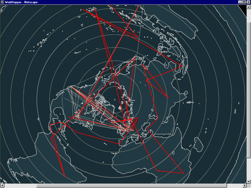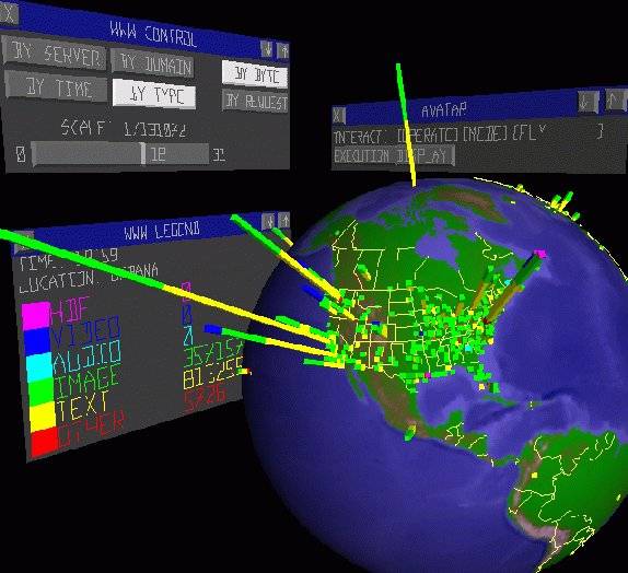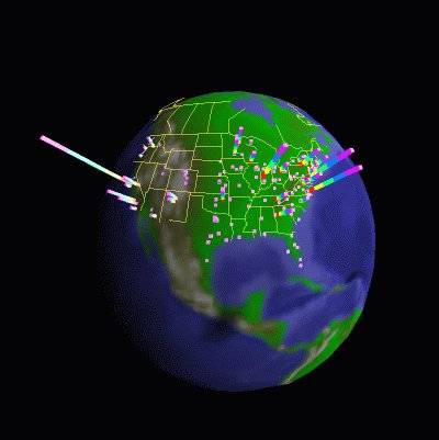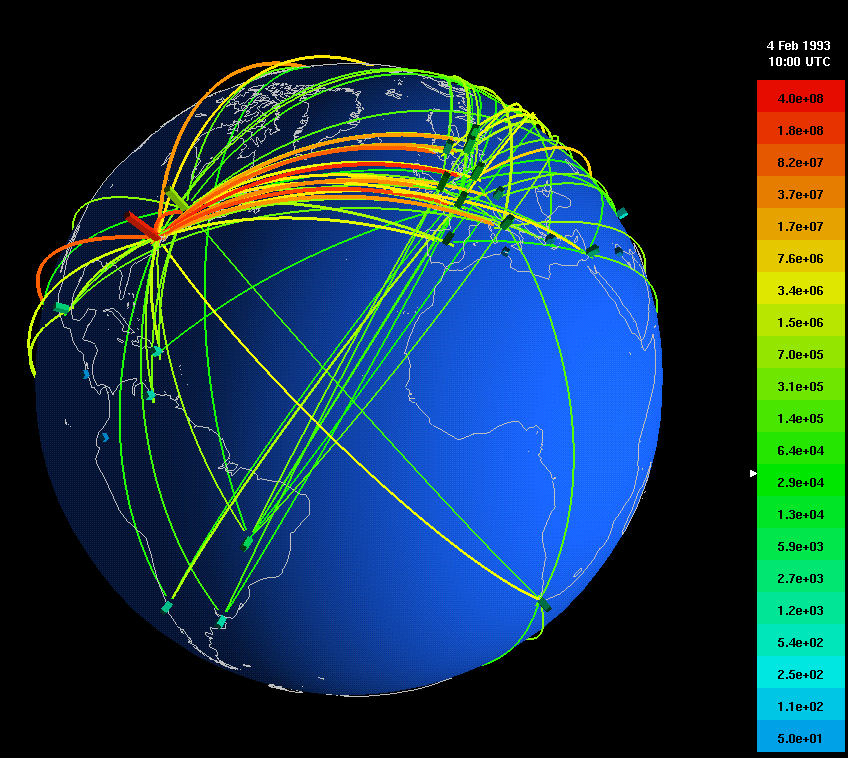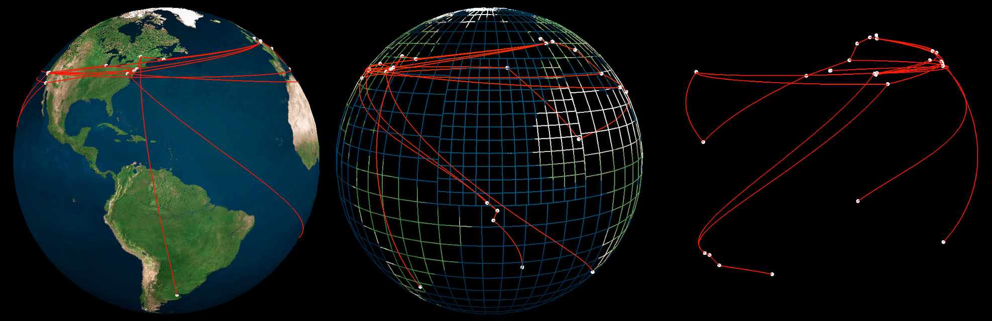 Tamara Munzner et ses collègues visualisent la topologie mondiale de MBone en utilisant un modèle géographique 3D du monde. Ces images donnent une première idée des visualisations produites.