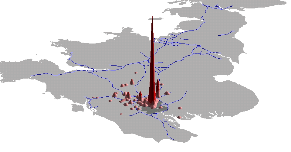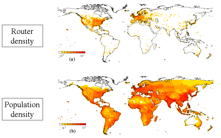 Analyse de la géographie de l'espace des adresses Internet, recherche menée par Martin Dodge et Narushige Shiode au sujet de la géographie des possessions des blocs d'adresses Internet (IIP) aux Royaumes Unis. |