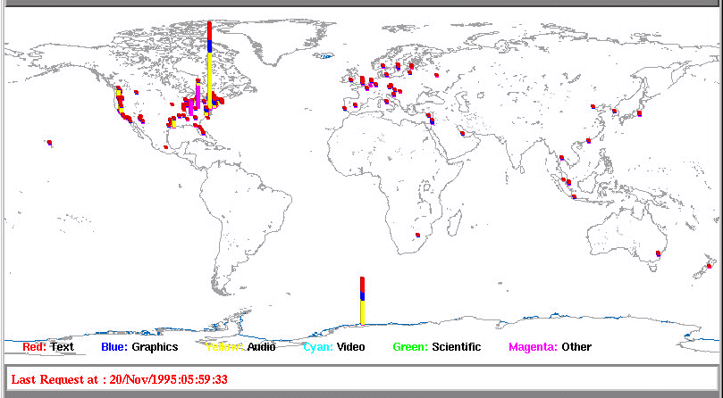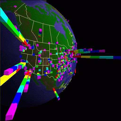 Deux exemples du travail de recherche de Stephen G. Eick et ses collègues aux laboratoires Bell, sur la visualisation et l'analyse du flux du trafic d'Internet. Leur article de recherche de 1996, "3D Geographic Network Display", fournit plus de détails. [Pour plus d'informations lire l'article la Carte du Mois "Missile Tracks Across the Net" dans le magazine Mappa Mundi.] |