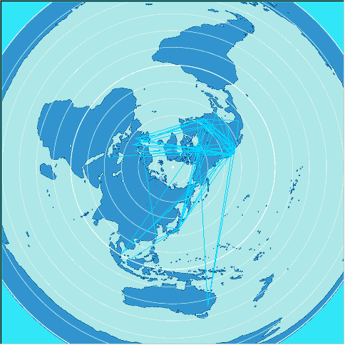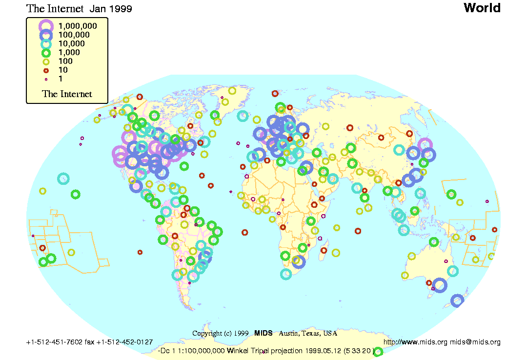 John Quarterman et ses collègues de Matrix.Net sont parmi les leaders de la cartographie et de l'analyse de la géographie d'Internet. Pour plus d'informationz lire l'article de la Carte du mois "MIDS Maps the Internet World" dans le magazine Mappa Mundi.] |