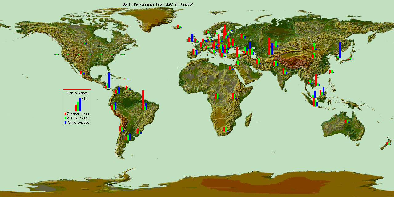 Une simple image extraite d'une carte animée montrant les performances mensuelles mesurées depuis Stanford dans 70 différents pays dans le monde. Cette carte est créée dans le cadre du projet PingER pour la surveillance des performances bout-à-bout d'Internet par des chercheurs du Centre de l'Accélérateur linéaire de Stanford. |