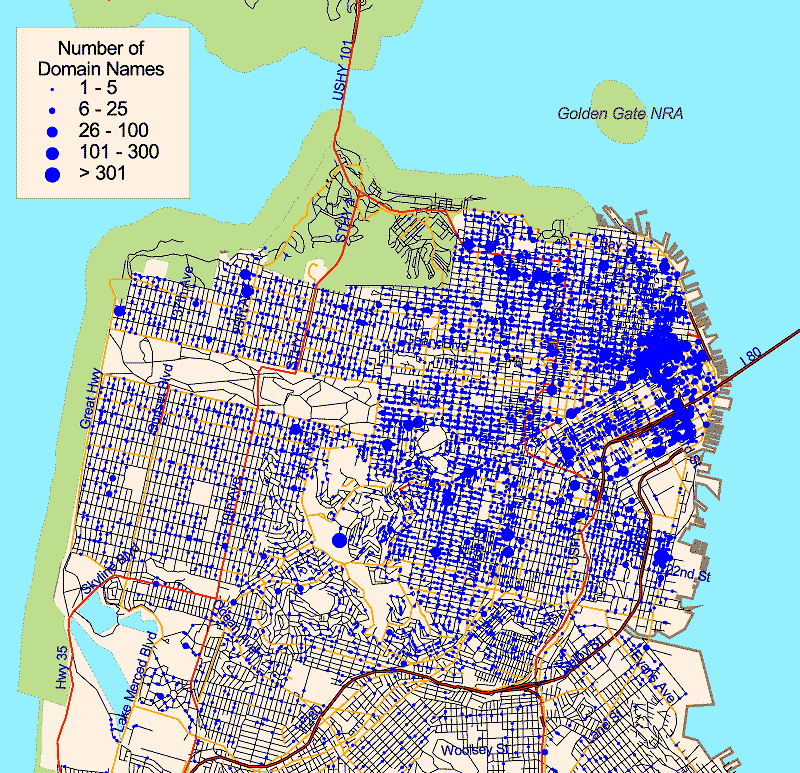 Une carte de la propriété de noms de domaine par rue pour le centre ville de San Francisco, durant l'été 1998. La carte a été produite par Matthew Zook dans le cadre du projet de Géographie d'Internet analysant les schémas spatiaux de l'industrie d'Internet.