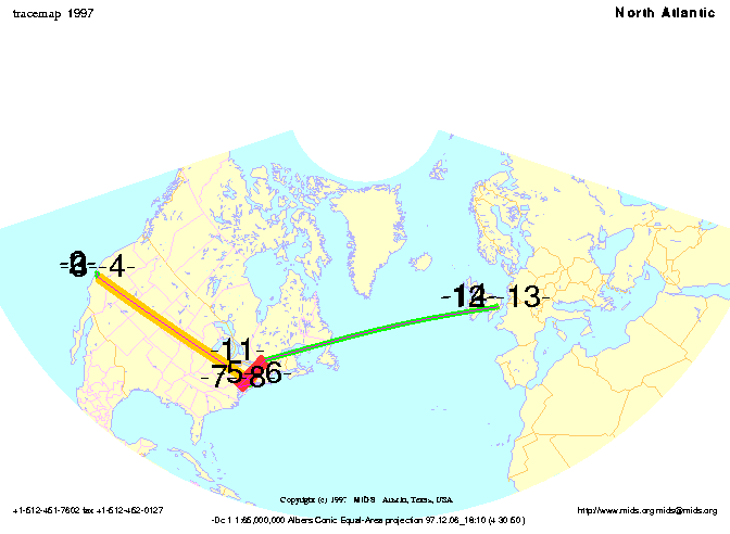 C:\>tracert www.cybergeography.com Tracing route to www.cybergeography.com [209.8.64.161] over a maximum of 30 hops: 1 10 ms <10 ms <10 ms cisco-2.bart.ucl.ac.uk [128.40.59.245] 2 10 ms 40 ms 10 ms 128.40.255.53 3 <10 ms <10 ms <10 ms 128.40.20.254 4 <10 ms <10 ms <10 ms atmr-ulcc.lonman.net.uk [194.83.100.62] 5 <10 ms <10 ms <10 ms atmr-ulcc.lonman.net.uk [194.83.100.62] 6 <10 ms 70 ms 40 ms tglobe-gw2.ja.net [193.63.94.80] 7 91 ms 90 ms 90 ms Teleglobe.net [207.45.215.201] 8 80 ms 90 ms 101 ms Teleglobe.net [207.45.215.2] 9 90 ms 130 ms 110 ms gin-nyy-ac1.Teleglobe.net [207.45.199.233] 10 110 ms 110 ms 110 ms gin-nyy-bb1.Teleglobe.net [207.45.201.33] 11 111 ms 120 ms 170 ms gin-maee-bb1.Teleglobe.net [207.45.223.2] 12 150 ms 121 ms 140 ms mae-east.cais.com [192.41.177.85] 13 120 ms 120 ms 111 ms hssi12-0.mcl1.cais.net [209.8.159.26] 14 110 ms 120 ms 120 ms 209.8.64.161 Trace complete.
