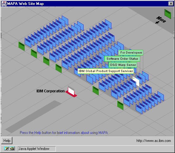 Dynamic Diagrams propose un produit Java nommé MAPA, qui produit des cartes de site web interactives. Deux exemples de cartes MAPA sont affichées ci-dessous, une correspondant à une partie du site web d'IBM Corporation, l'autre correspondant à une partie du site de Dynamic Diagrams. [Pour plus d'informations voir l'article de la Carte du Mois "Web Site Maps from Dynamic Diagrams" dans le magazine Mappa Mundi.] |