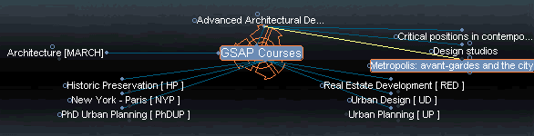 Une carte de site interactive appelée SiteBrain. Il s'agit d'un développement basé sur la technologie de modélisation de l'information de TheBrain pour le Web. La capture d'écran ci-dessus montre l'exemple d'une cartographie du site de graduate school of architecture and planning de l'Université de Columbia. |